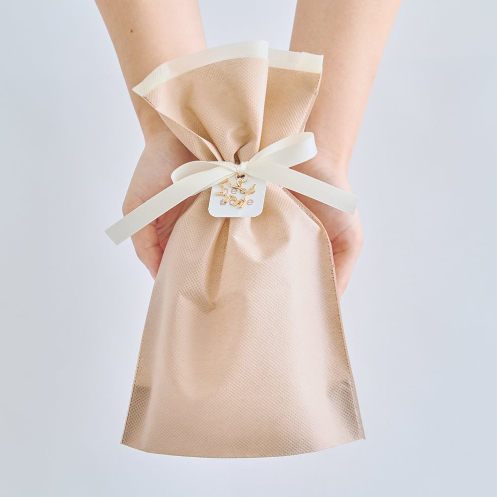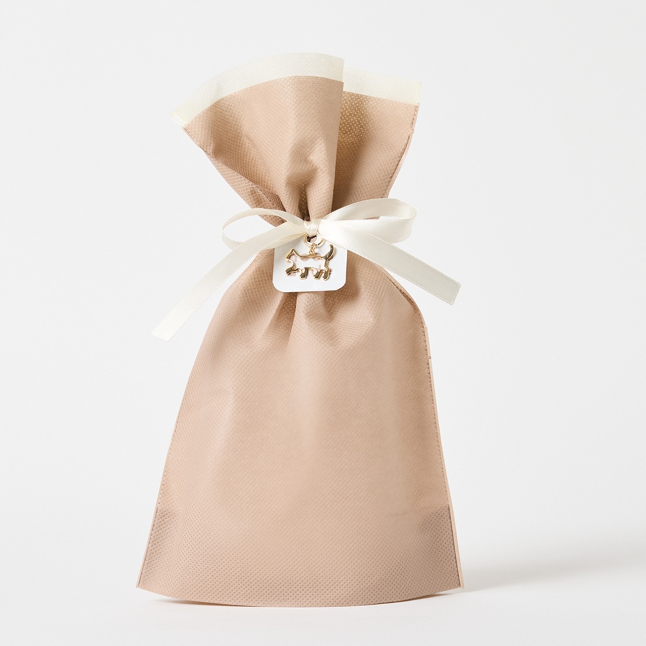 不織布のリボン付きラッピングバッグと、かわいい猫型チャームでラッピングしてお届けします。