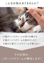 猫に有害な成分を含まないハンドクリームです。敏感肌にも安心で、べたつきにくく、猫を撫でても毛が付きにくい使用感が特徴。猫と触れ合う大切な手肌に、安心と潤いをプラスする特別なアイテムです。